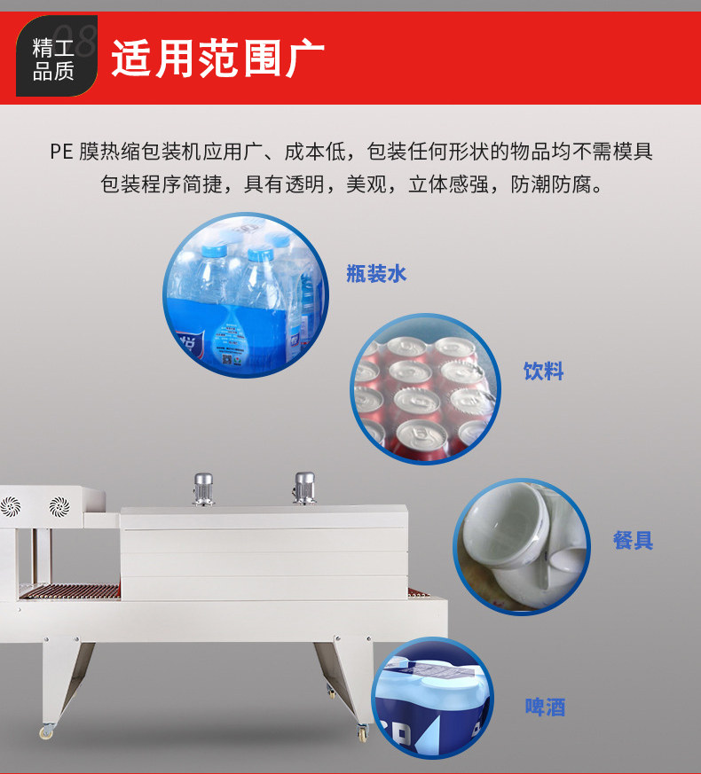 • 飲料包裝:在飲料行業(yè),熱收縮機(jī)主要用于瓶體和易拉罐的外包裝。比如,對于整箱的瓶裝飲料,熱收縮機(jī)可以將塑料薄膜緊緊包裹在飲料箱上,起到固定和保護(hù)作用。同時,通過熱收縮包裝,也能在一定程度上防止飲料瓶在運(yùn)輸過程中因碰撞而破碎,并且在瓶身標(biāo)簽等信息外再添加一層防護(hù),保持外觀整潔。