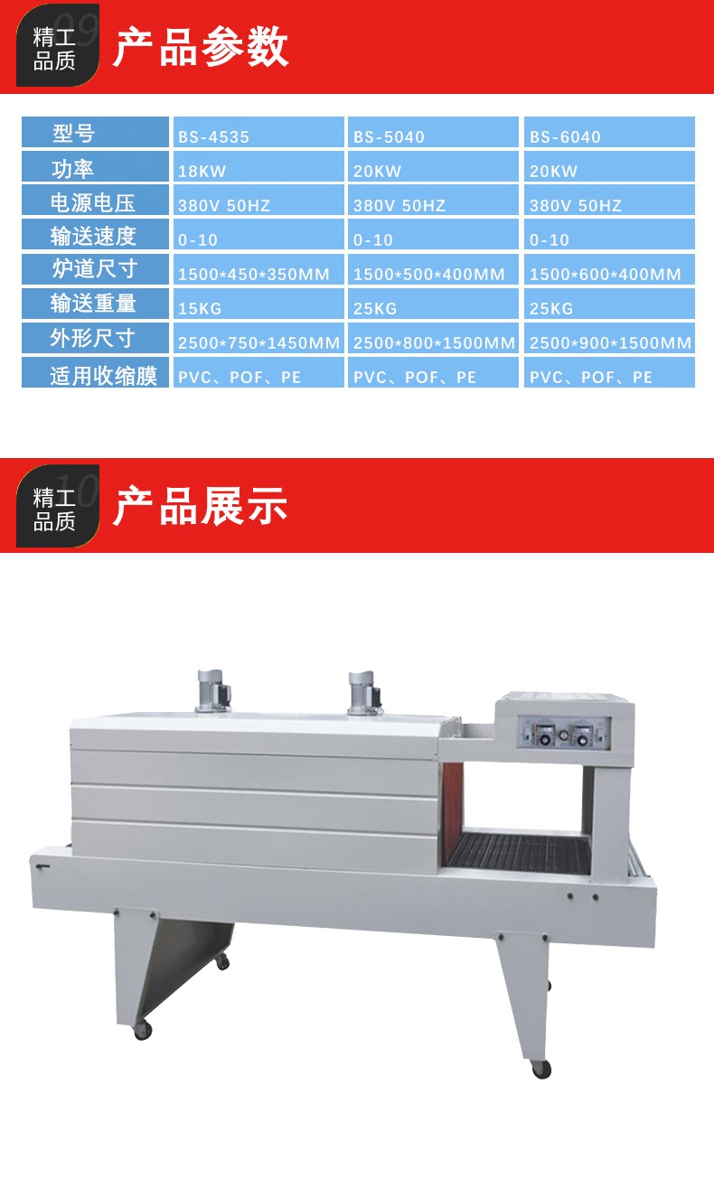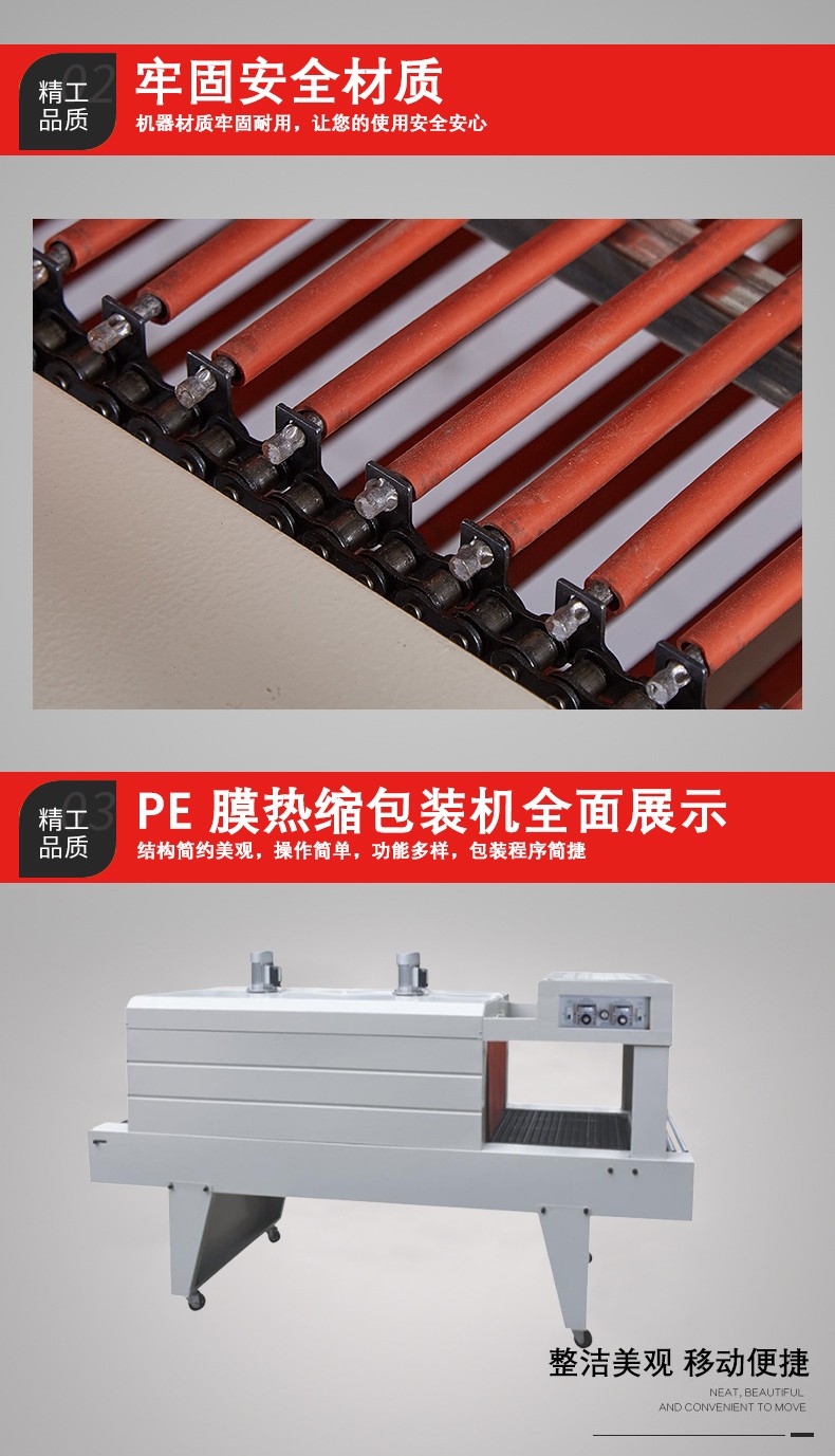 它主要是利用熱收縮薄膜在受熱時會產(chǎn)生收縮的特性來對產(chǎn)品進行包裝。當(dāng)包裝好產(chǎn)品的熱收縮薄膜被送入熱收縮機的加熱通道后,熱空氣均勻地包裹薄膜,使薄膜分子活動加劇,從而產(chǎn)生收縮,緊密地貼合在產(chǎn)品表面,達到良好的包裝效果。
